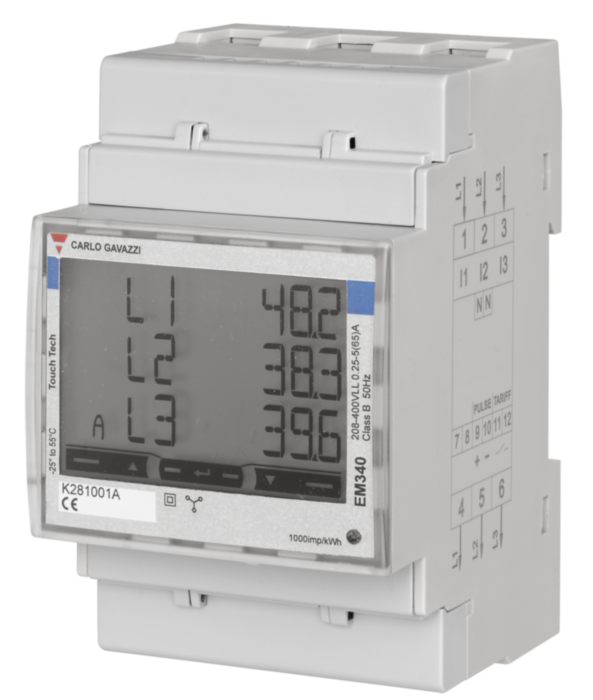 EM340DINAV23XS1X is a energy meter 3-phase Standardized dimensions: 54 mm (W) x 91 mm (H) x 63 mm (D).